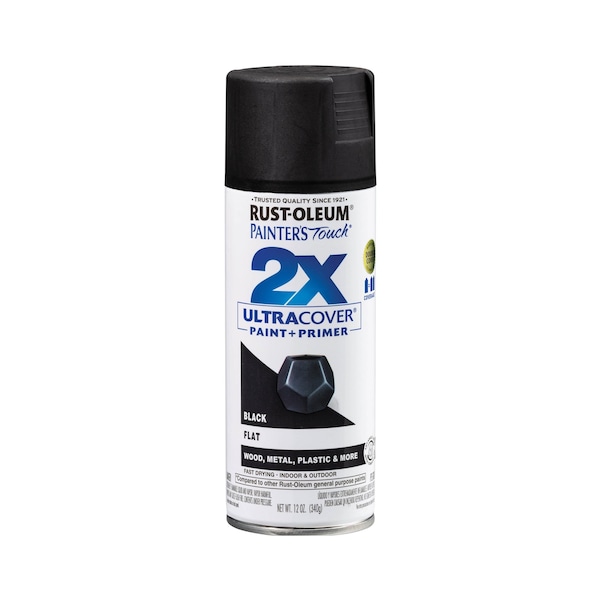 General Purpose Spray Paint, Opacity 0 Percent, Maximum Dry Film Thickness 2 mil, Coating Application General Purpose, Color Family Black, Compatible Surface Material Metal, Plastic, Wood, Sheen Flat, Finish Texture No Texture, Resin Type Acrylic Modified Alkyd, Color Black, Container Size 12 oz, Coverage Area 8 to 12 sq ft, Base Type Solvent, Dry Time 24 hr, Use Location Exterior, Interior, Sub Brand Painter's Touch 2X, Container Type Can, Dry Time to Recoat 1 hr, Flammability Flammable