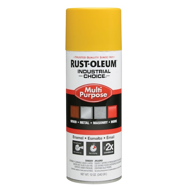 Spray Paint, Opacity 80 Percent, Maximum Dry Film Thickness 2 mil, Coating Application General Purpose Spray Paint, Color Family Yellow, Compatible Surface Material Masonry, Metal, Plastic, Wood, Sheen Gloss, Finish Texture Smooth, Resin Type Modified Alkyd, Color OSHA Safety Yellow, Container Size 12 oz, Coverage Area 15 sq ft, Base Type Solvent, Dry Time 1 hr, Use Location Exterior, Interior, Sub Brand Industrial Choice, Container Type Aerosol Can, Dry Time Tack Free 10 min