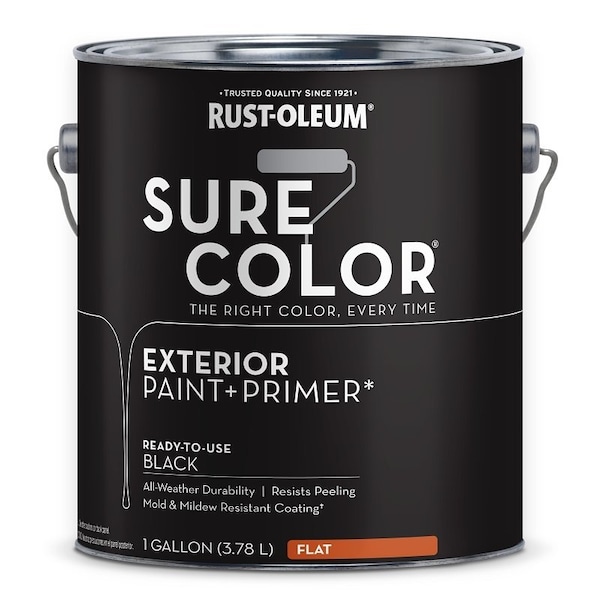 Sure Color Exterior Paint and Primer, Water, Flat, Black, 1 gal Can, 400 sq-ft/gal Coverage Area