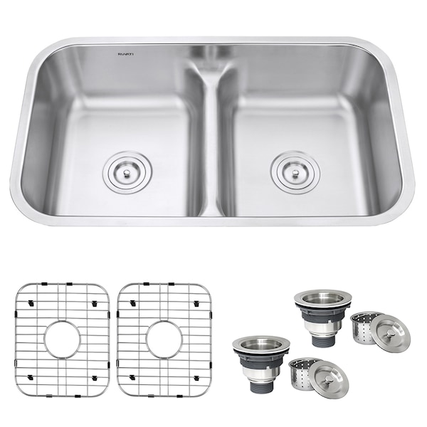 32" Low-Divide 50/50 Double Bowl Undermount 16 Gauge SS Kitchen Sink