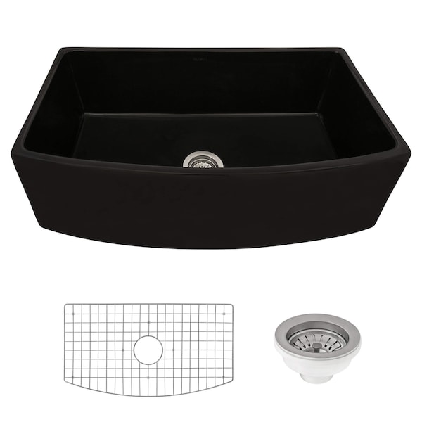 33 inch Fireclay Black Farmhouse Kitchen Sink Bow Front Curved Apron Single Bowl