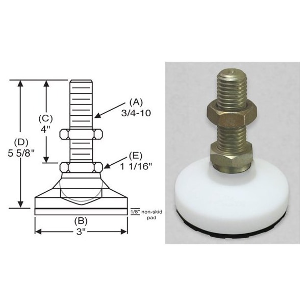 Male-End Leveling Mount, Leveling Mount Type Swiveling Stud, Base Dia. 3 in, Height 5.63 in, Load Capacity 1,800 lb, Thread Size 3/4 In.-10, Construction Steel, Hex 1-1/16 in, Includes Jam Nut, Connection Type Threaded Stud, Bolt Length 4 in, Finish Yellow Zinc-Plated, Base Material Acetal Homopolymer, Thrust Pad Material Elastomer, Swivel Angle 15 Degrees , Base Shape Round, Series Level-It, Base Delrin(R) w/ Non-Skid Pad, Socket Material Not Applicable