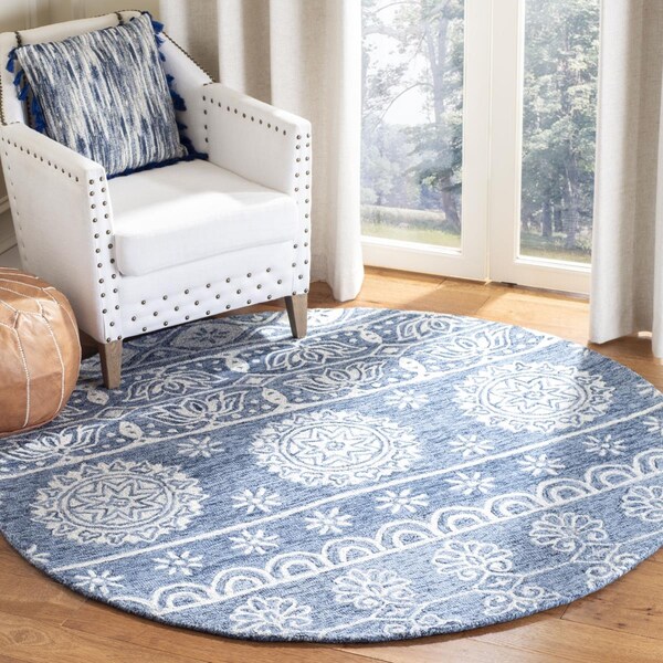 Micro-Loop Bohemian Round Hand Hooked Rugs, Blue & Ivory - 5 x 5 ft.