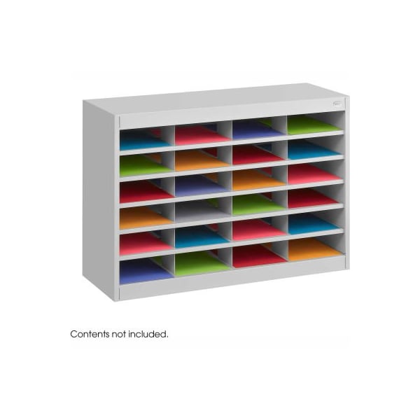 quality-built, premium steel unit has a strong steel frame, shelves, and dividers with a solid fiberboard back. Interlocking design of the shelves and dividers add extra strength to hold up to the heaviest load. Wide shelf fronts serve as generous label holders. Unit features twenty-four letter-size compartments. Each compartment will hold up to 750 sheets. The organizer can be placed on the floor, desk or table, and can even be mounted to a wall with optional wall mount brackets. 24 compartments total. Gray finish.
