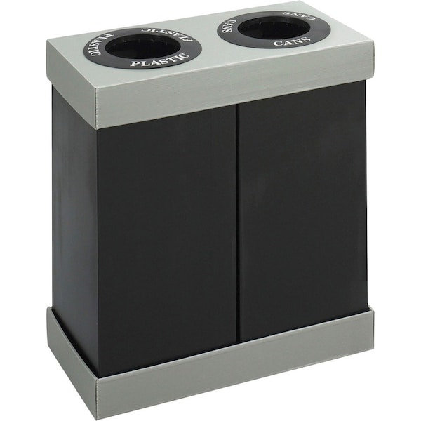 Recycling center features two separate 28 gallon bins under one lid to help keep recyclables sorted and all in one place. Decals are included to help customize your recycling center to fit your office needs. Recycling center is 100 percent recyclable and is made of impact-resistant and moisture-resistant polyethylene. The top and bottom are made of cardboard.