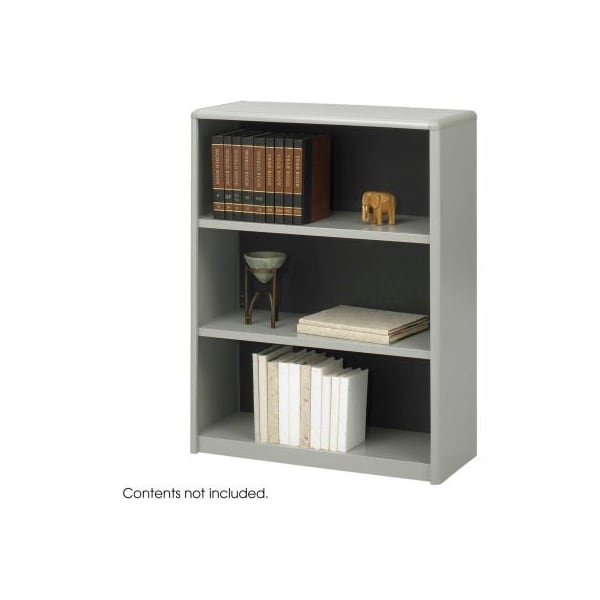 economical, sturdy, and strong with the valuemate bookcases you can't go wrong the shelf and exterior of the bookcase are constructed of steel and the back is made of solid fiberboard. Attractive, plastic snap-in radius corners make assembly easy and add to the overall strength of these units. Generous 12" deep shelves accommodate 3-ring binders and large publications. Includes three shelves. Gray finish.
