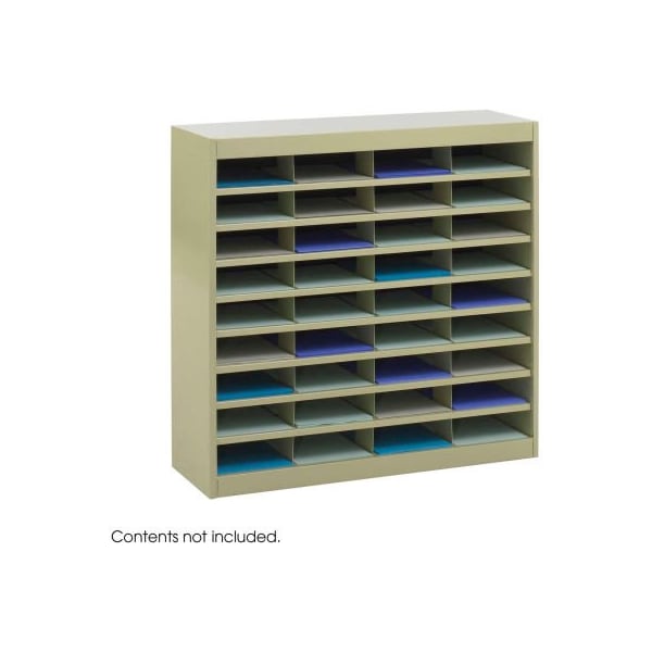 quality-built, premium steel unit has a strong steel frame, shelves, and dividers with a solid fiberboard back. Interlocking design of the shelves and dividers add extra strength to hold up to the heaviest load. Wide shelf fronts serve as generous label holders. Unit features thirty-six letter-size compartments. Each compartment will hold up to 750 sheets. The organizer can be placed on the floor, desk or table, and can even be mounted to a wall with optional wall mount brackets. 36 compartments total. Sand finish.