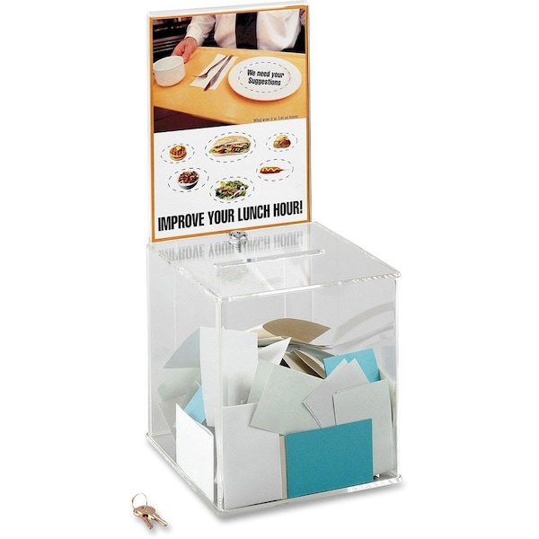 Locking collection box is great for collecting drawing slips, raffle tickets, employee nominations, fund-raising and more. The generously sized graphic area lets you easily customize and change your message. Entire back panel slides out for easy access to contents. The 5-3/4" wide x 1/2" deep slot in the top allows multiple-sized slips to be used. Back display area is 8-1/2" wide x 11" high. The locking box includes two keys and is made from acrylic.