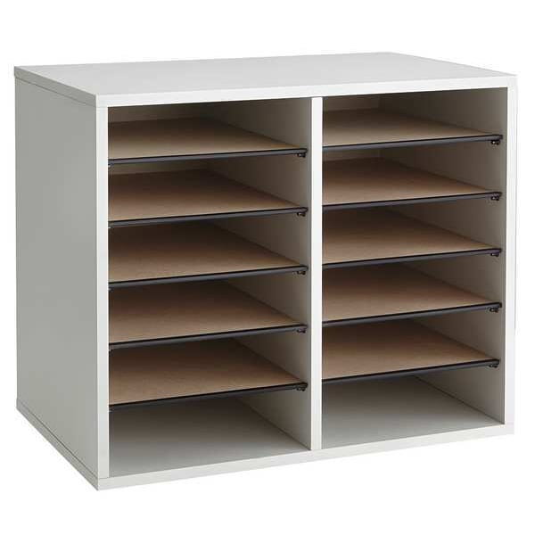 Adjustable Literature Organizer, Construction Solid FiberboardHardboardParticleboard, Height 16 in, Width 19 1/2 in, Depth 12 in, Color Gray, Number of Compartments 12, Load Capacity 15 lb