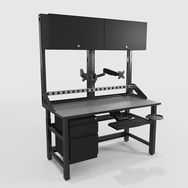 Computer Workstation, Product Type Computer Workstation, Overall Height 86 in, Overall Depth 30 in, Number of Trays 1, Overall Width 60 in, Number of Cabinets 2, Weight Capacity 1,000 lb, Number of Shelves 0, Color Black, Gray, Material Laminate, Steel, Number of Display Mounts 2, Standards ANSI/BIFMA