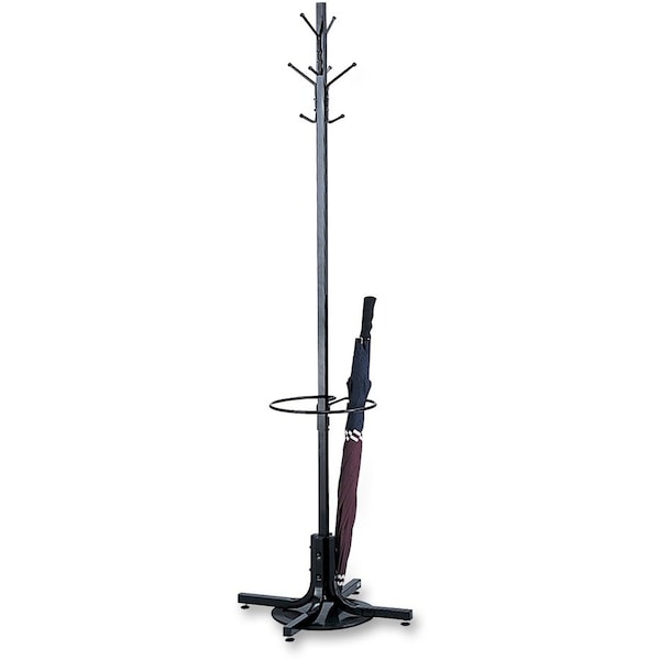 Freestanding costumer features four double hooks, an umbrella stand and 12-1/2" diameter drip pan. Steel hooks securely hold up to eight garments. Each hook holds up to 10 lb. Ball tips on hooks prevent damage to garments. Wide 21" base provides stability. 1" square tube is made of 16 gauge steel with powder-coat finish.