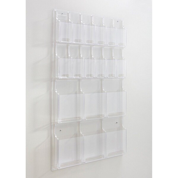 Display rack features six magazine pockets and 12 pamphlet pockets. Each pocket holds up to 1-3/4" of material. Unobtrusive, break-resistant, crystal clear plastic rack blends into any office environment. Display insert keeps magazines, pamphlets and other literature straightened while preventing curling and flopping of pocket contents. Thermoformed one-piece units have no sharp edges or corners. Use included hardware to mount to a wall. Each magazine pocket measures 9-1/4" wide x 11-1/4" high. Each pamphlet pocket is 4-1/4" wide x 9-3/8" high. Display rack weighs 12 lb.