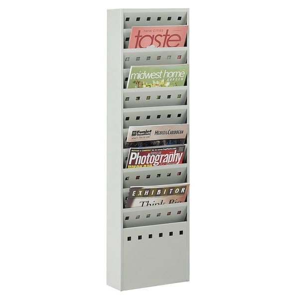 Literature Rack, Product Type Literature Rack, Number of Compartments 11, Includes Label Holders No, Overall Height 36 1/4 in, Overall Depth 4 in, Overall Width 10 in, Material Steel, Color Gray, Literature Form Factor Letter, Swivel No, Assembly Assembled, Compartment Capacity 3 lb, Compatible Grainger Part Number Not Applicable, Compartment Depth 3/4 in, Compartment Height 7 1/4 in, Compartment Type Pocket, Compartment Width 9 in, Includes Mounting Hardware Yes, Mountable Yes