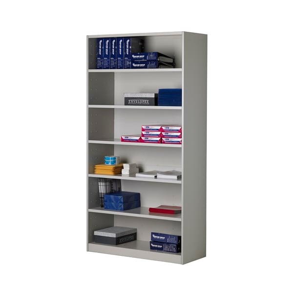 Bookcase, Product Type Bookcase, Material Laminate, PVC, Steel, Number of Dividers 0, Overall Height 80 in, Overall Depth 16 in, Overall Width 42 in, Caster Type Not Applicable, Color Gray, Back Style Closed, Number of Shelves 5, Weight Capacity 300 lb, Shelf Adjustment Increment 3 3/4 in, Standards Not Applicable, Shelf Capacity 50 lb, Assembly Unassembled, Caster Material Not Applicable, Depth Form Factor Legal, Distance Between Dividers Not Applicable