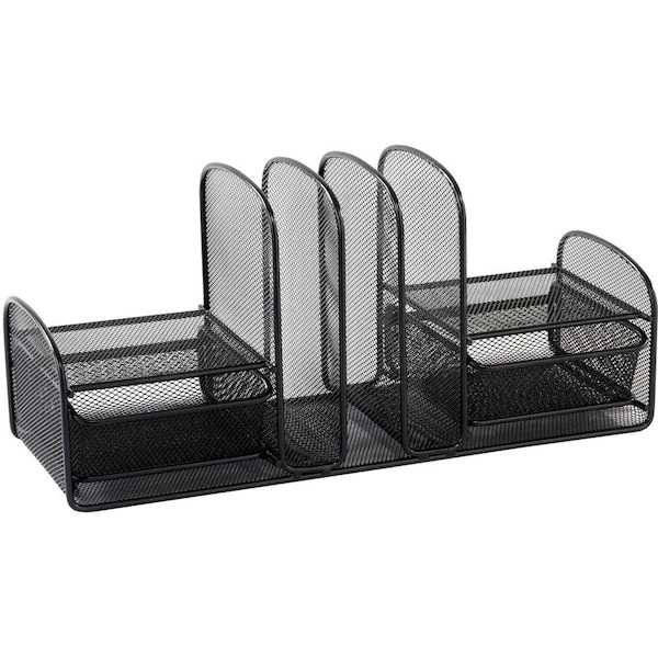 Multipurpose Mesh Desktop Organizer features three vertical file compartments for file folders or binders. Store small items in two slide-out baskets for easy access. Organizer has side shelves on top of basket for PDAs, cell phones and other small items. Greenguard Certified.