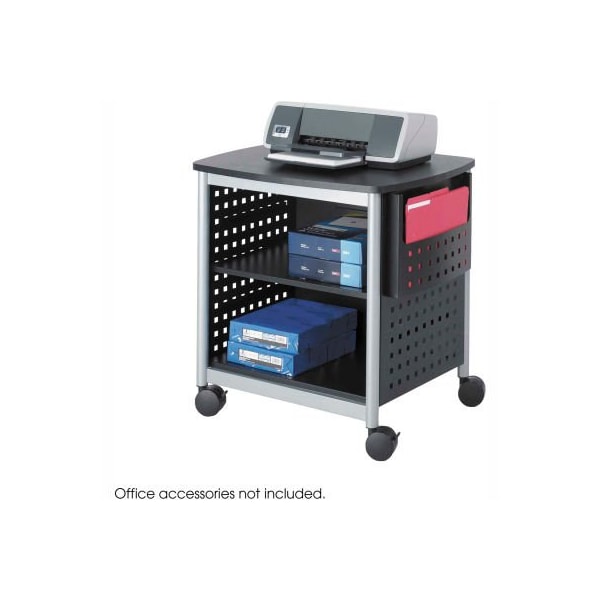 Safco products scoot desk-side printer stand an easy way to free up desk space and keep additional printing supplies close at hand. Large enough to accommodate most desktop printers and other small office machines. The middle shelf and side attachment can be height-adjusted or removed to allow easy access to printing supplies. The top shelf holds up to 100 lb. The lower shelves hold up to 50 lb. Features an attractive black stand with a unique hole pattern design, silver leg accents and a powder-coat steel frame finish. Mobile on four dual-wheel casters (two locking).