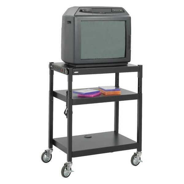 Media Cart, Overall Width 27 1/4 in, Overall Length 27 1/4 in, Minimum Overall Height 36 1/2 in, Material Steel, Number of Shelves 3, Caster Type (2) Locking, (4) Swivel, Weight Capacity 40 lb, Standards Not Applicable, Caster Diameter 4 in, Cabinet Depth Not Applicable, Cabinet Height Not Applicable, Cabinet Width Not Applicable, Finish Powder Coated, Number of Cabinets Not Applicable, Number of Locking Cabinets Not Applicable, Number of Outlets 6, Powered Yes, Shelf Adjustment Increment 2 in