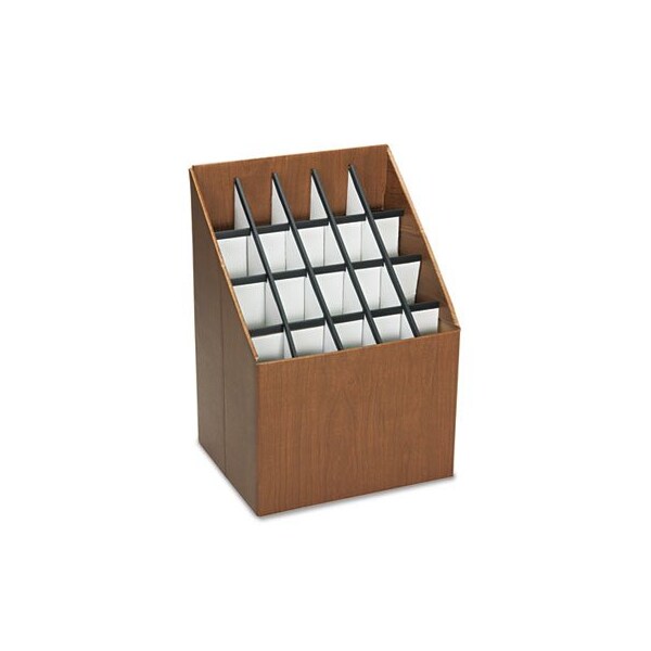 Efficient and economical storage. Shorter rolls store in front, longer rolls in back, all visible. Durable corrugated fiberboard. Color: Woodgrain; Compartment Quantity: 20; Compartment Size: 2.75 x 2.75; Overall Width: 15in.