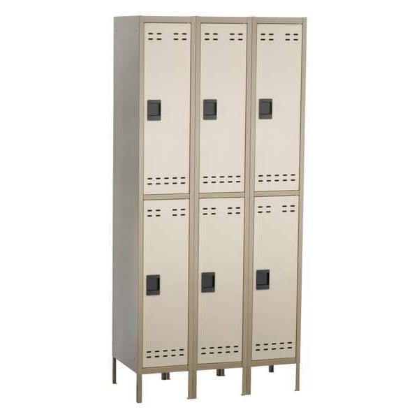Wardrobe Locker, Audit Trail Storage None, Frame Assembled Assembled, Number of Tiers 2, Number of Units Wide 3, Door Type Louvered, Frame Material Thickness 25 ga, Includes Number Plates No, Locker Color Tan, Lock Type Padlock Hasp, Overall Depth 18 in, Overall Height 78 in, Overall Width 36 in, Handle Type Recessed Lift, Locker Material Steel, Number of Lockers 6