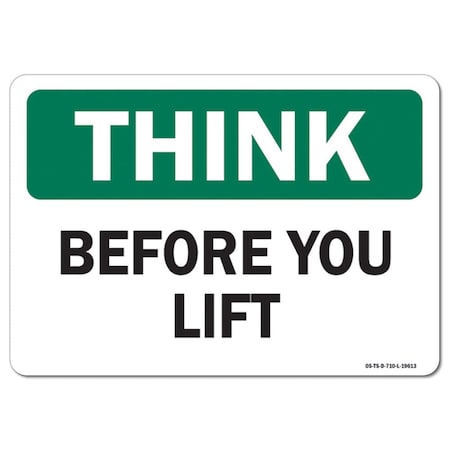 OSHA Think Sign, Before You Lift, 10in X 7in Aluminum, 7" W, 10" L, Landscape, Before You Lift
