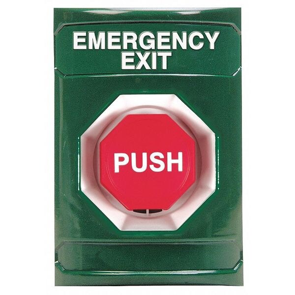 Emergency Exit Push Button, Type Key-To-Reset, Material Polycarbonate, Depth 2 7/8 in, Height 4 7/8 in, Width 3 1/4 in, Color Green, Operating Temp. 15 to 120 Degrees F, Standards UL, cUL, ADA, For Use With Emergency Systems, Includes -