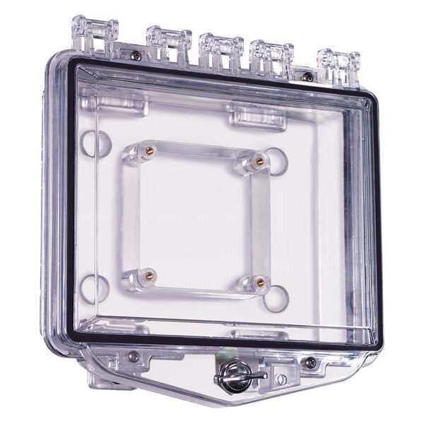 Enclosure, Enclosed Back, Indoor, Outdoor, Color Clear, Material Polycarbonate, Mounting Surface, Width 10 in, Depth 10 in, Height 3 1/4 in, For Use With Keypads, Annunciators, Volume Controls, Lighting Controls, Etc., Operating Temp. -40 Degrees to 250 Degrees F, Features Clear Polycarbonate, Multipurpose Lockable Enclosure Helps Protect Large Units Against Physical or Environmental Damage, Includes Enclosed Back Box, Double Gang Electrical Box, Exterior Thumb Lock, Gaskets, Mounting Hardware