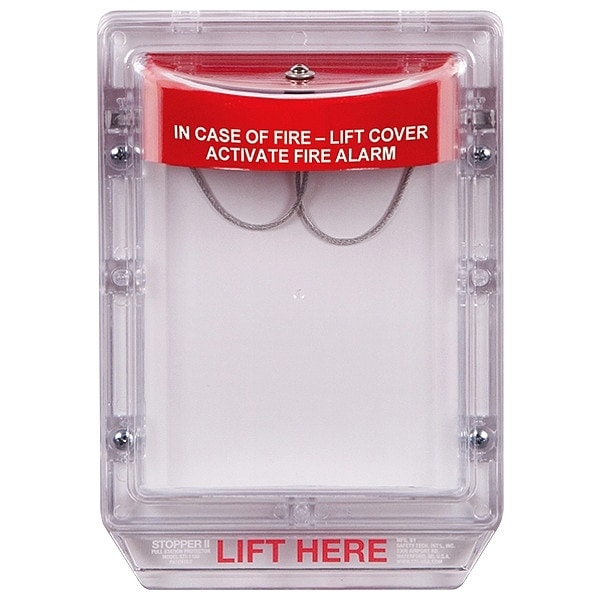 Pull Station Guard, Open Back, Indoor, Color Clear, Red, Material Polycarbonate, Mounting Surface, Width 6 7/8 in, Depth 3 1/4 in, Height 8 7/8 in, For Use With Pull Stations, Operating Temp. -40 Degrees to 250 Degrees F, Standards ADA Compliant, MEA 49-00-E, UL/cUL Listed, Features Helps Stop False Alarms, Includes Mounting Hardware