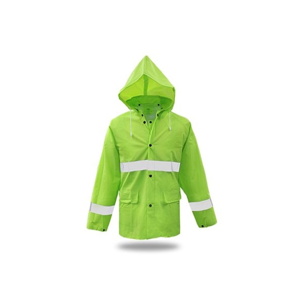 Large, High Visibility, Fluorescent Green, 35 mm, Lined PVC Rain Jacket, Detachable Hood, NonCorrosive, NonConductive Plastic Snaps, Polyester Lined, 35 mm Fluorescent Green Fly Front, TakeUp Snaps On Cuffs, 2 Patch Pockets With Snaps
