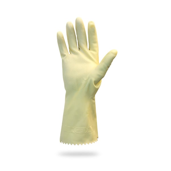 ProWorks Latex, flock-lined, gloves, universally known as the “dishwashing gloves,” offer good hand protection for food processing, industrial handling, and pharmaceutical manufacturing, where they are commonly used. These Amber, 18 mil thick, 12 inch long, natural latex gloves provide a flexible fit, touch sensitivity, and dexterity, for effective use in various applications like food and meat processing, canning, light chemical handling, and operating industrial machinery.