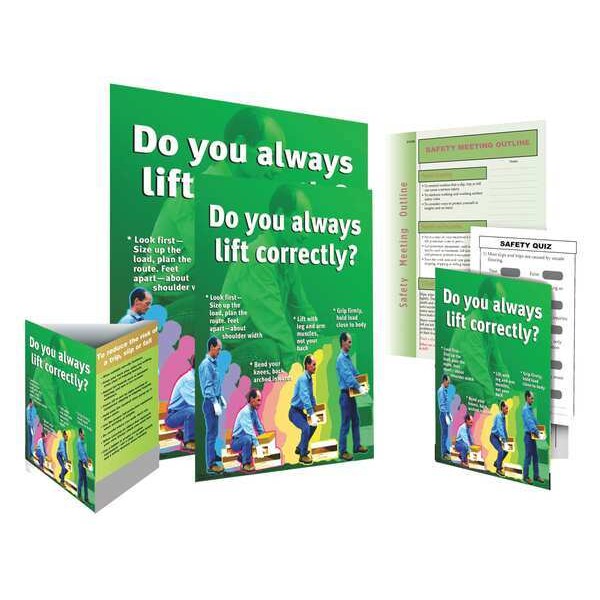 Training Kit, For Use With Not Applicable, Format Card, Outline, Poster, Signs, Height 24 in, Includes 22 in x 17 in Poster, Safety Meeting Outline, (2) 17 in x 11 in Posters, (2) Table Tent Signs, (25) Employee Quiz Cards, Number of Users Supported 25, Operating System Requirements Not Applicable, Product Type Training Kit, Regulations Covered Based on Industry Best Practices, Software Delivery Method Not Applicable, Subject Matter Workplace Safety, Supported Languages English