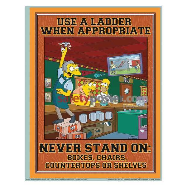 Simpsons Safety Poster, Shape Vertical Rectangle, Safety Banner Legend Use A Ladder When Appropriate Never Stand On Boxes Chairs Countertops Or Shelves, Sign Legend Style Symbol and Text, Printed Language English, Series Simpsons, Background Color Various, Number of Printed Sides 1, Width 17 in, Height 22 in, Thickness 0.005 in