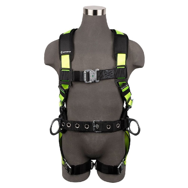 PRO Construction Harness: 3D, QC Chest/LegsThe PRO Harness is a dependable workhorse, incorporating premium features for outstanding performance. Built with ergonomically designed padding and high-vis abrasian-resistant green webbing. Models equipped with corrosive resistant steel-plated D-rings, buckles and quick-connects. Offered in a variety of configurations.Attachment Points 1 dorsal D-ring, 2 side positioning D-ringsWeight 4.1 lbs. 1.9 kgANSI Weight Capacity 130-310 lbs. 59-141 kgOSHA Weight Capacity Up to 420 lbs. 191 kgANSI Standards Z359.11-2021OSHA Standards 1926.502, 1910.140