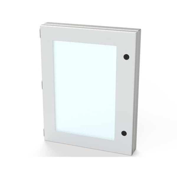 Designed to mount on the exterior of an enclosure to provide protection for controls with easy access. ELJ hinges. Black mini quarter turn latches. UV stable polycarbinate viewing window. Gasket and hardware included. For outdoor application a drip shield and drain vent is recommended