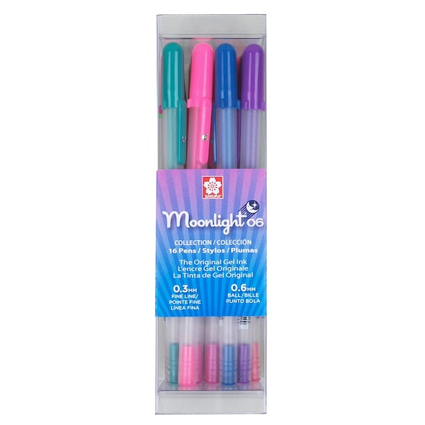 Sakura changed the game by making the first gel ink pen in the 1980's. Their famous Gelly Roll series now has 20 colors, including 5 bright fluorescents, and 5 shades of gray. The Moonlight version works great on both light and dark papers because of its paint-like ink. With both fine and bold tips, the smooth, thick ink is great for journaling, decorating cards, drawing patterns, or adding details. The larger Bold 10 tip is perfect for coloring and effects that look like paint, while the Fine 06 tip dries quickly to avoid smudges. All the colors look bright on white paper and really stand out on black paper. Sakura also has the most neutral gray shades for adding things like shadows and details to your art. There are two kinds of Moonlight ink: archival and fluorescent. The archival type is made with pigment ink thats stable, waterproof, and won't fade. The fluorescent type can fade in sunlight but will glow under black light. This Cube Collection 16 pc set in size 06 Fine tip size consists of 1 each Fluorescents: FL. Yellow, FL. Orange, FL. Vermillion and 2 each: Fl. Pink, Fl. Green, Rose, Purple, Green, Blue.