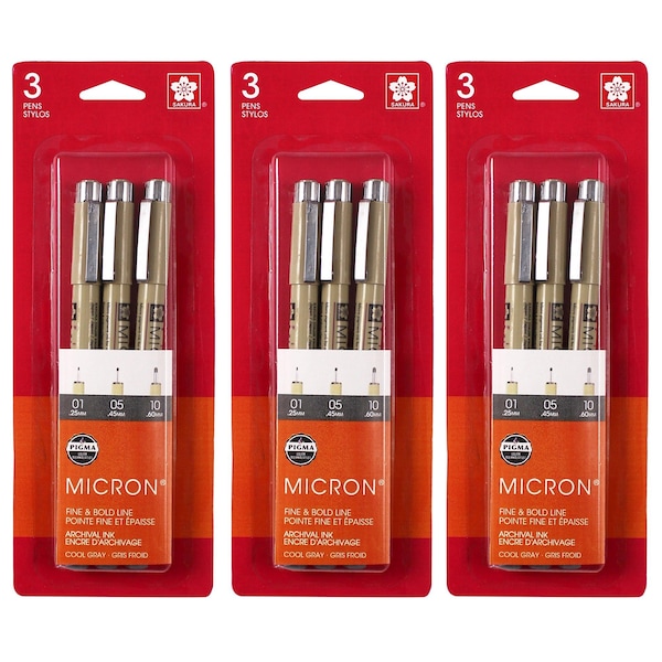 Pigma Micron Pens, Cool Gray, Assorted Sizes, 3PK