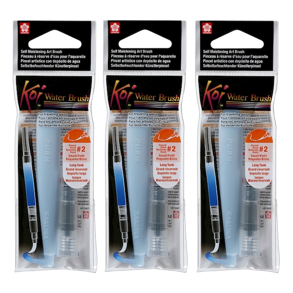 Work on your watercolors anywhere and at any time with the Koi Water Brush! Koi Water Brushes are designed for easy transportation and storage of water when youre away from home or the studio. The brush separates into two parts: a fine flexible brush tip, and a barrel handle with a plug to carry water. This paint brush has a unique refillable water reservoir, including a stopper to prevent water from leaking when detaching the water brush. The comfortable grip is great for controlled blending, shading, and highlighting. Sold as a pack of 3.