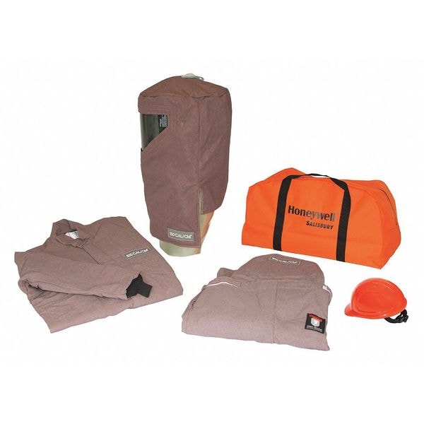 Arc Flash Clothing Kit, Khaki, Size XL, Fits Chest Size 56 in, Fits Waist Size 56 in, Inseam 30 in, Material TuffWeld Fabric, Hazard Risk Category (HRC) 4, Standards NFPA 70E, Includes Arc Flash Coat, Bib Overall, Hard Hat, PRO-HOOD, Safety Glasses, Storage Bag
