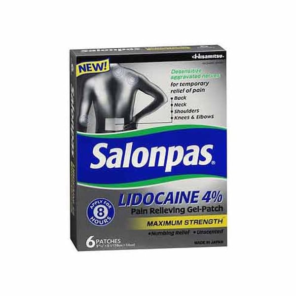 Salonpas pain relief patch contains 4% lidocaine Salonpas topical patch soothes aches and pains in the neck, shoulders, back and joints Benefit from fast-acting relief without using any heat The sturdy fabric patch moves with your body without peeling off One patch gives you 8 hours of comforting relief One box contains six 3-15/16 x 5-1/2 inch patches