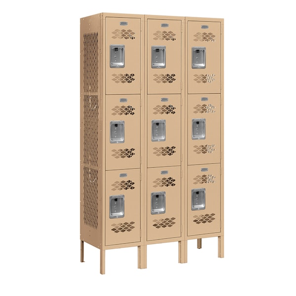 3 Tier Vented Locker, 36"Wx66"Hx12"D, 9 Door, Tan, Unassembled