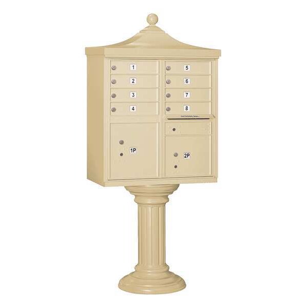 Regency Cluster Box Unit, USPS Access, Number of Doors 8, Color Sandstone, Height 71-3/4 In., Depth 18-1/2 In., Width 31 In., Box Material Aluminum, Loading Front, Mounting Pedestal, Orientation Horizontal, Slot Capacity 11-3/4 In. W x 3/4 In. H, Door Material Aluminum, Finish Powder Coated, Post Height 28-1/2 In., Post Material Aluminum, Post Thickness 12 In., Net Weight 190 lb., Standards ISO 9001: 2008, Includes Pedestal