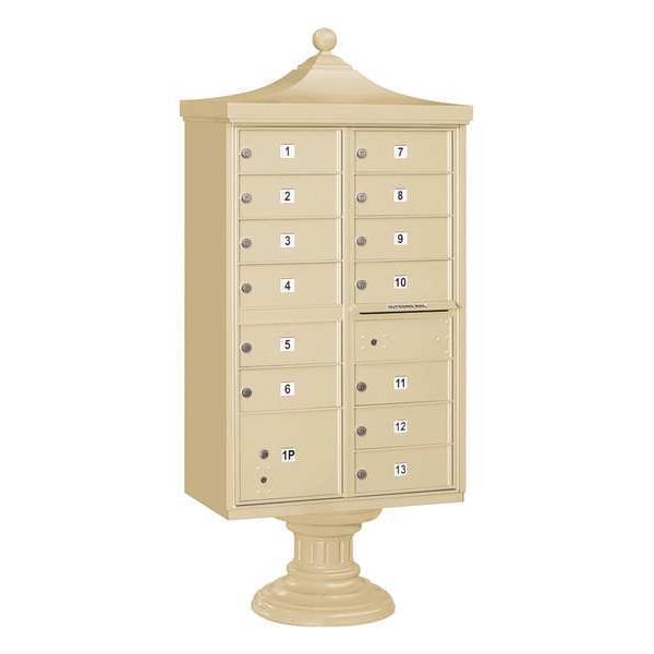 Regency Cluster Box Unit, USPS Access, Number of Doors 13, Color Sandstone, Height 71-3/4 In., Depth 18-1/2 In., Width 31 In., Box Material Aluminum, Loading Front, Mounting Pedestal, Orientation Horizontal, Slot Capacity 11-3/4 In. W x 3/4 In. H, Door Material Aluminum, Finish Powder Coated, Post Height 14-1/2 In., Post Material Aluminum, Post Thickness 12 In., Net Weight 205 lb., Standards ISO 9001: 2008, Includes Pedestal