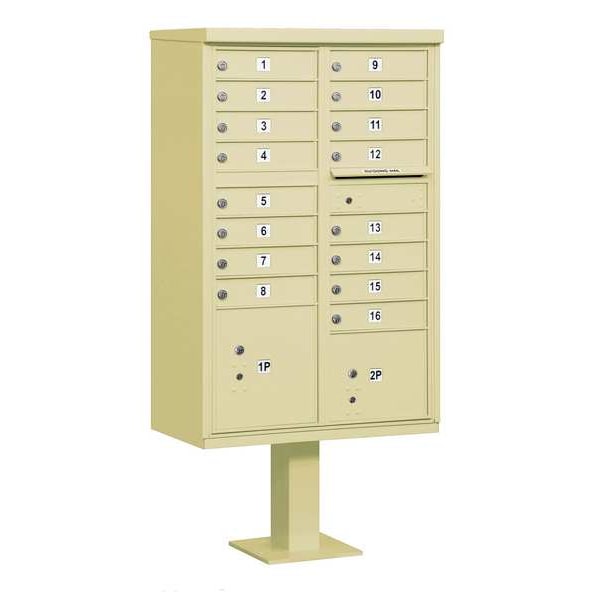 Cluster Box Unit, 3 Type, Number of Doors 18, Color Sandstone, Height 62-3/4 In., Depth 30-1/2 In., Width 18 In., Box Material Aluminum, Loading Front, Mounting Pedestal, Orientation Horizontal, Slot Capacity 11-3/4 In. W x 3/4 In. H, Door Material Aluminum, Finish Powder Coated, Post Height 14-1/2 In., Post Material Aluminum, Post Thickness 12 In., Net Weight 165 lb., Includes Pedestal