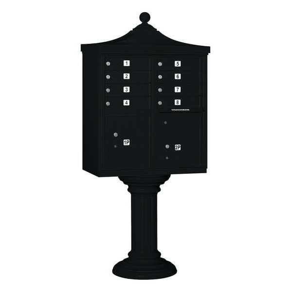 Regency Cluster Box Unit, USPS Access, Number of Doors 8, Color Black, Height 71-3/4 In., Depth 18-1/2 In., Width 31 In., Box Material Aluminum, Loading Front, Mounting Pedestal, Orientation Horizontal, Slot Capacity 11-3/4 In. W x 3/4 In. H, Door Material Aluminum, Finish Powder Coated, Post Height 28-1/2 In., Post Material Aluminum, Post Thickness 12 In., Net Weight 190 lb., Standards ISO 9001: 2008, Includes Pedestal