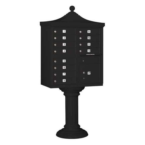 Regency Cluster Box Unit, USPS Access, Number of Doors 12, Color Black, Height 71-3/4 In., Depth 18-1/2 In., Width 31 In., Box Material Aluminum, Loading Front, Mounting Pedestal, Orientation Horizontal, Slot Capacity 11-3/4 In. W x 3/4 In. H, Door Material Aluminum, Finish Powder Coated, Post Height 28-1/2 In., Post Material Aluminum, Post Thickness 12 In., Net Weight 190 lb., Standards ISO 9001: 2008, Includes Pedestal