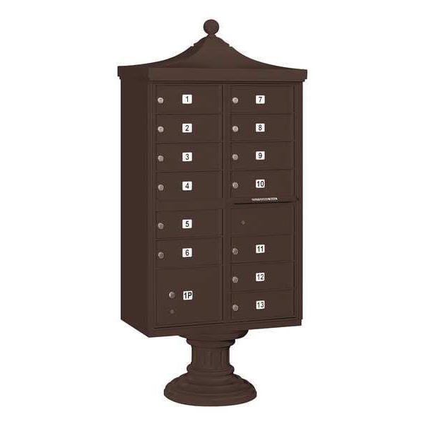 Regency Cluster Box Unit, USPS Access, Number of Doors 13, Color Bronze, Height 71-3/4 In., Depth 18-1/2 In., Width 31 In., Box Material Aluminum, Loading Front, Mounting Pedestal, Orientation Horizontal, Slot Capacity 11-3/4 In. W x 3/4 In. H, Door Material Aluminum, Finish Powder Coated, Post Height 14-1/2 In., Post Material Aluminum, Post Thickness 12 In., Net Weight 205 lb., Standards ISO 9001: 2008, Includes Pedestal