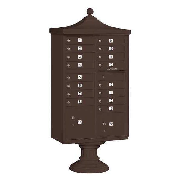 Regency Cluster Box Unit, USPS Access, Number of Doors 16, Color Bronze, Height 71-3/4 In., Depth 18-1/2 In., Width 31 In., Box Material Aluminum, Loading Front, Mounting Pedestal, Orientation Horizontal, Slot Capacity 11-3/4 In. W x 3/4 In. H, Door Material Aluminum, Finish Powder Coated, Post Height 14-1/2 In., Post Material Aluminum, Post Thickness 12 In., Net Weight 215 lb., Standards ISO 9001: 2008, Includes Pedestal
