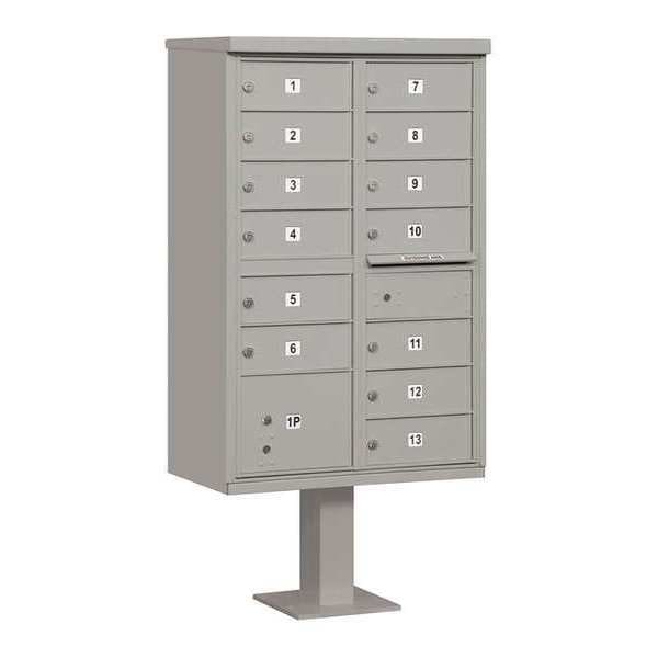 Cluster Box Unit, Standard, Number of Doors 14, Color Gray, Height 62-3/4 In., Depth 18 In., Width 30-1/2 In., Box Material Aluminum, Loading Front, Mounting Pedestal, Orientation Vertical, Cabinet Capacity 30-1/2 In. W x 62-3/4 In. H x 18 In. D, Slot Capacity 11-3/4 In. W x 3/4 In. H, Door Material Aluminum, Finish Powder Coated, For Use With Apartments, Commercial Buildings, Residential Developments, Indoor and Outdoor Facilities, Post Height 14-1/2 In., Post Material Aluminum