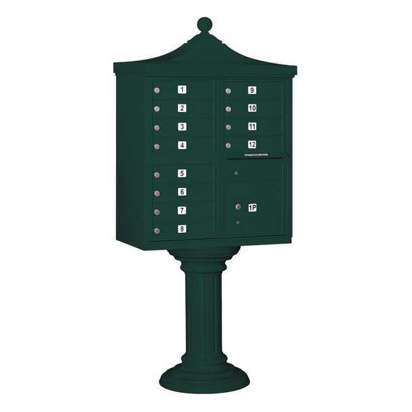 Regency Cluster Box Unit, USPS Access, Number of Doors 12, Color Green, Height 71-3/4 In., Depth 18-1/2 In., Width 31 In., Box Material Aluminum, Loading Front, Mounting Pedestal, Orientation Horizontal, Slot Capacity 11-3/4 In. W x 3/4 In. H, Door Material Aluminum, Finish Powder Coated, Post Height 28-1/2 In., Post Material Aluminum, Post Thickness 12 In., Net Weight 190 lb., Standards ISO 9001: 2008, Includes Pedestal