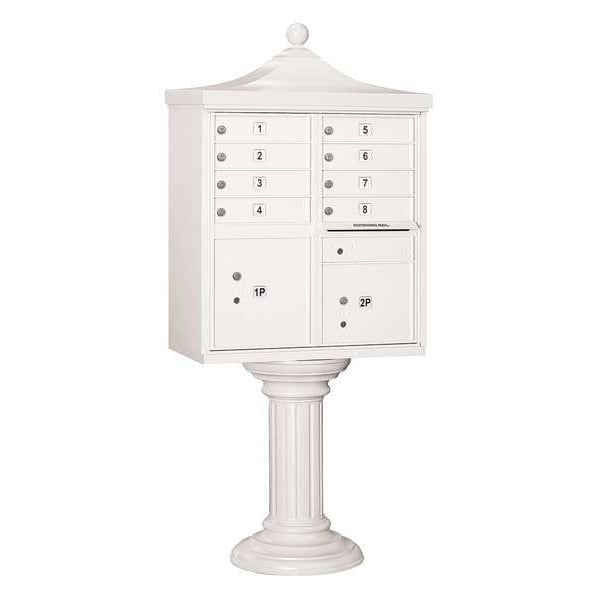 Regency Cluster Box Unit, USPS Access, Number of Doors 8, Color White, Height 71-3/4 In., Depth 18-1/2 In., Width 31 In., Box Material Aluminum, Loading Front, Mounting Pedestal, Orientation Horizontal, Slot Capacity 11-3/4 In. W x 3/4 In. H, Door Material Aluminum, Finish Powder Coated, Post Height 28-1/2 In., Post Material Aluminum, Post Thickness 12 In., Net Weight 190 lb., Standards ISO 9001: 2008, Includes Pedestal