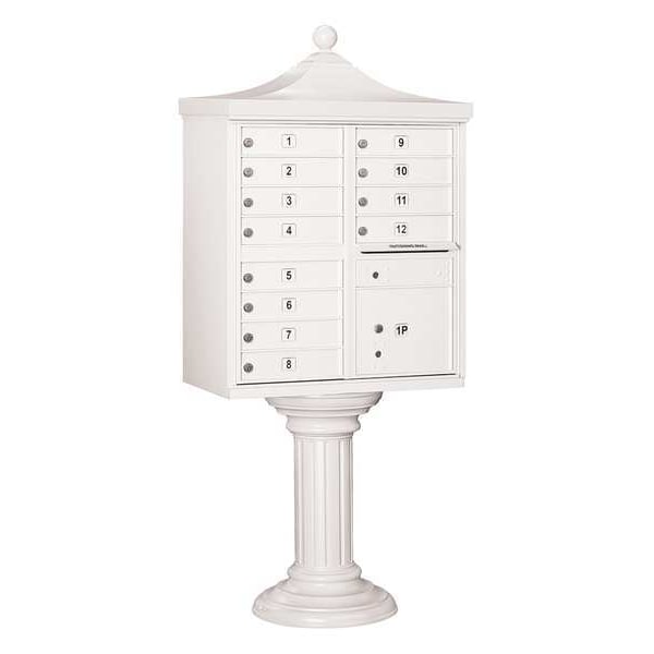 Regency Cluster Box Unit, USPS Access, Number of Doors 12, Color White, Height 71-3/4 In., Depth 18-1/2 In., Width 31 In., Box Material Aluminum, Loading Front, Mounting Pedestal, Orientation Horizontal, Slot Capacity 11-3/4 In. W x 3/4 In. H, Door Material Aluminum, Finish Powder Coated, Post Height 28-1/2 In., Post Material Aluminum, Post Thickness 12 In., Net Weight 190 lb., Standards ISO 9001: 2008, Includes Pedestal